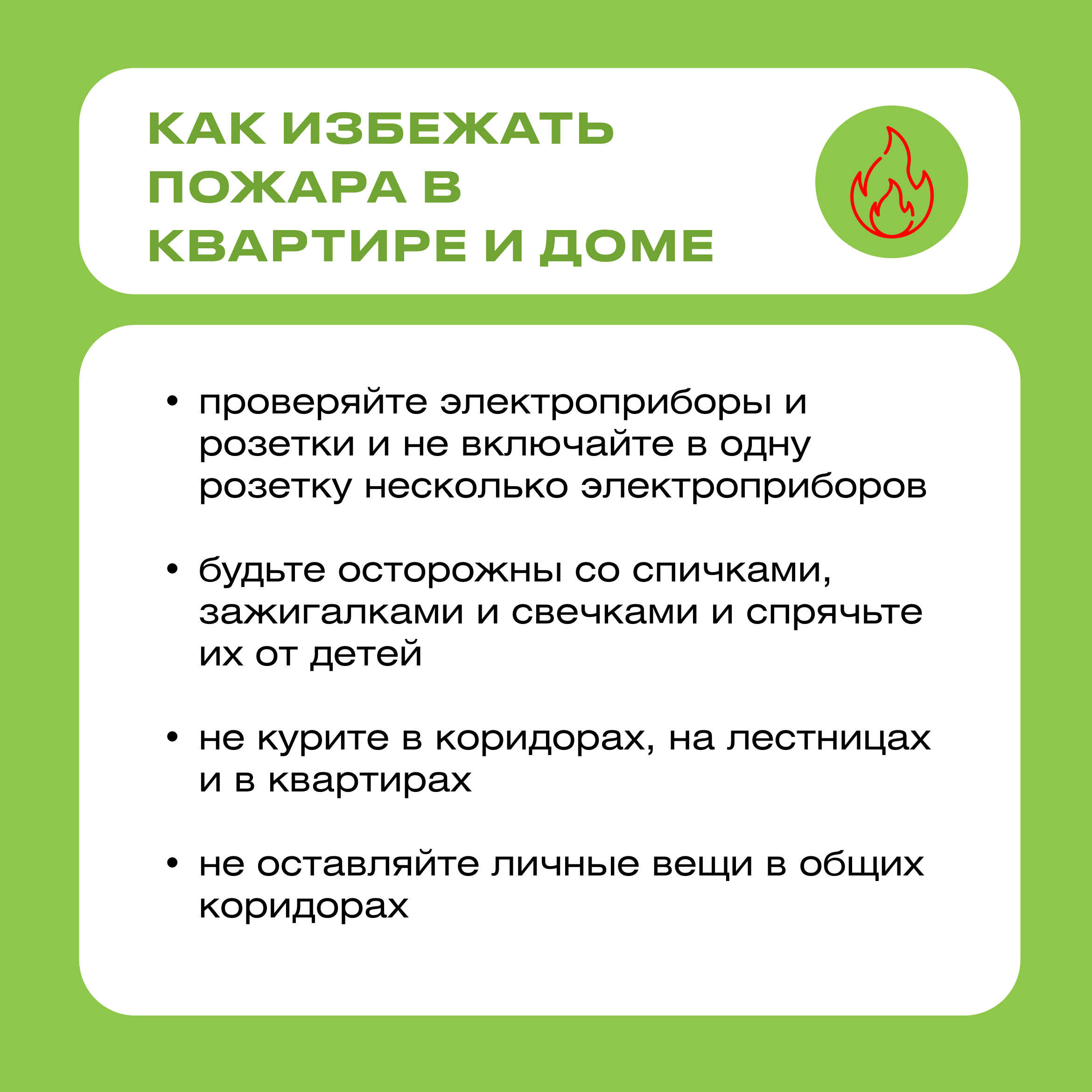 Чтобы не подвергать опасности себя и своих соседей, не забывайте соблюдать правила пожарной безопасности.